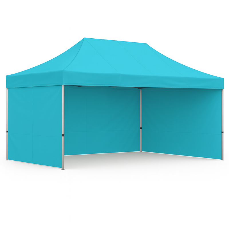 Tente pliante 3x4.5m avec une surface au sol de plus de 13m² au sol avec pack bâches latérale et porte couleur Turquoise, l’alliée idéale de vos événements professionnels ou privés. Facile à monter et à transporter, elle allie praticité, design moderne et solidité éprouvée. Sa structure robuste en acier et sa toile imperméable haute qualité assurent une protection optimale quelles que soient les conditions. Un espace abrité, élégant et résistant pour accueillir vos visiteurs en toute sérénité.